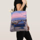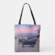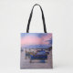 Sunset over harbor with fishing boats tote bag