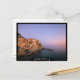 Photo postcard of the purple sky at sunset over the lovely village Manarola, built on the rocks above the Mediterranean Sea at the coast of the Cinque Terre area in Liguria, Italy with a black edge and the curved text 'Manarola'.