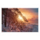 View of sunset over winter landscape with sea and covered in snow pine trees against dramatic evening light. Snowy sea coast