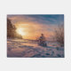 Panoramic view of sunset over winter landscape with covered in snow pine and fir trees against dramatic evening light. Snowy Baltic sea coast.