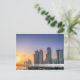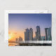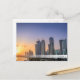Postcard of a colourful sunset over the skyline with the skyscrapers on the Corniche in the city centre of Doha, capital of the Gulf country Qatar with a fading bar and the text: 'Qatar'.
