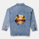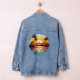 On the back of this denim jacket is an artist's image of a brilliant setting sun over a lagoon. The light of the sun is reflected in the water, with palm trees framing the scene.