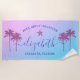 Personalised beach towel design for a girls' beach vacation getaway features a custom first name in modern script writing accented with a starfish and framed by tropical palm trees. Personalise with a name and custom text for the special occasion. Background includes a pretty sunset gradient in violet, purple, and blue colours.