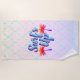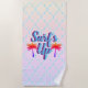 Sunset palm trees & quatrefoils surf's up beach towel in vibrant hues of orange, purple, blue, and pink! This beach towel is trendy and eye catching!