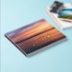 An inviting guestbook design featuring a sunset photo by Destei in orange and purple tones. The front includes elegant script text that reads “Guestbook” beneath a personalizable line for the family name and lake house title. A beautiful way to welcome visitors and preserve special memories at your lakeside retreat, vacation home or cabin.