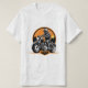 Stylized illustration of a motorcyclist wearing a helmet riding a custom motorcycle, rendered in black and white on an orange background with a setting sun and silhouetted trees, enclosed in a circular emblem with the word “BIKER”.