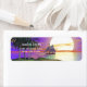Return address label with my artwork of a sailboat sailing past an island and palm trees with a big setting sun in a sky of purple and yellow clouds.