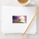 A gift tag or address label with a tropical sailing scene of a sailboat sailing past an island and palm trees with a setting sun in a sky of purple and yellow clouds.