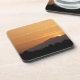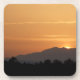 Beautiful Sunset Coasters - The sun dipping behind a mountain with the foreground in silhouette and a vivid orange sky behind.