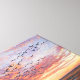 A breathtaking sunset over a vast wetland landscape. The sky is ablaze with vibrant hues of orange, pink, and purple, creating a dramatic backdrop for the scene. A flock of birds, likely geese or swans, is flying in a V-formation against the colourful sky, adding a sense of movement and dynamism to the composition. In the foreground, a large group of white birds, possibly swans or cranes, are gathered in the shallow water, their reflections creating a mirror-like effect on the surface. The overall atmosphere is serene and peaceful, capturing the beauty of nature and the tranquillity of the wetland ecosystem.