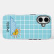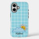 Cute phone case with a happy yellow sunshine peeking out from a big blue cloud with a template below to add your name, quote, text or delete to leave blank. The background is a light blue colour with a white grid.