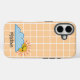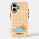 Cute phone case with a happy yellow sunshine peeking out from a big blue cloud with a template below to add your name, quote, text or delete to leave blank. The background is a peach colour with a white grid.