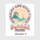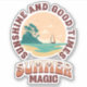 Retro style design with "Sunshine and good times" and "Summer magic" text design with grunge summer scene with sea, sailing boat and mountains decoration