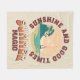 Retro style design with "Sunshine and good times" and "Summer magic" text design with grunge summer scene with sea, sailing boat and mountains decoration