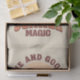 Retro style design with "Sunshine and good times" and "Summer magic" text design with grunge summer scene with sea, sailing boat and mountains decoration