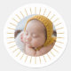 Highlighting your little bundle of joy, our Sunshine Baby Photo Circle Sticker adds a charming touch to your announcements or thank you cards. Featuring a sunny design with a circle photo template at the centre, this sticker is perfect for showcasing your baby's adorable face. Use it as an envelope seal or to add a personal touch to various baby-related stationery. Capture the essence of your newborn's sweetness and share it with friends and family with this delightful sticker. Whether it's announcing their arrival or expressing gratitude for gifts, this sticker is a lovely addition to any baby-related correspondence.