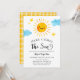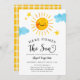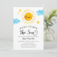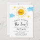 Cute baby shower invitation card featuring watercolor illustration of a smiling sunshine with stars and clouds. The text says "Here comes the son"
