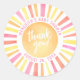 This round sticker design features a vibrant sun at the centre, with the cheerful phrase "Thank You!" placed right on top. The sun's rays shine in bright, bold shades of yellow, orange, pink, and red, adding a lively and joyful pop of colour to your baby shower.