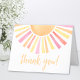 This bright and cheerful sun-themed thank you card is the perfect way to express gratitude after your celebration. The front of the folding card features a vibrant sun at the top with colourful rays in shades of yellow, pink, orange, and red, bringing warmth and joy to your message. Below the sun, the phrase "Thank You!" is displayed in elegant script, with fonts in soft yellow, pink, and orange hues to match the sunny theme.