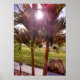 Photograph of sunburst or sunstar shining through the Palm Trees, and a Birdbath is to the left of the Palm Trees, as a Poster or Print. This photograph is copyrighted by me, the Photographer.