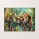 Super Cute Happy Pixie jigsaw puzzle. © Jigsaw Wonderland at Zazzle. A super cute happy and laughing Pixie with a green dress, green hair, boots and hat and large ears.