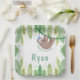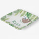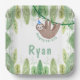 Fun light and dark green jungle leaves decorate these jungle theme | sloth birthday paper plates. Super cute sloth hanging from a bright green vine in the jungle. Fun loving sloth is sporting a blue and white polka dot party hat! Perfect paper plates for animal, zoo, sloth, or other safari / jungle theme birthday.