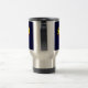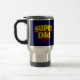 Stainless steel travel mug with blue background, Show love for your favourite super hero with this awesome super dad fathers day design, great for dad on his special day, birthday or any occasion. Is your new dad a superhero dad? Show him you care. Design features blue rays of light behind super dad in funny extruded 3d text in colours of red, yellow and bright blue.