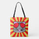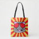 rat doodle face on vintage red and yellow star burst background all over print tote bag