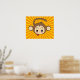 An illustration of a monkey face with blushing cheeks and his tongue sticking out. Looking cute and kawaii. The background is a cheerful yellow and orange pattern with sunrays bursting out around the monkey making him look super powerful.