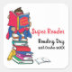 Reading day reading on a stack of book's event stickers. Customise with your own reading day event date and achievement. Original superhero boy sitting on a stack of books reading superhero book drawing and design by www.mylittleeden.com