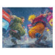 Feel the thunder of battle with this electrifying Dragon Ball-inspired illustration: Super Saiyan Goku with blazing golden hair clashes mid-air against a fierce rival in a torrential downpour over a glowing neon cyberpunk city. Rain streaks, splashing puddles, and vibrant pink-blue-red billboards create intense drama and motion—perfect for anime fans, gamers, teen rooms, man caves, posters, or as epic gifts for Dragon Ball lovers and action enthusiasts.