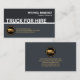 A stylish slogan signage "TRUCK FOR HIRE" sits near the centre demarcating an upper dark grey layer against its lighter counterpart below ; You can edit this caption remarks to suit your own service needs. Below this lies a gold truck logo you can use with the contact details beside it. At the top are your prestigious name and job title.