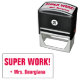 This fun rubber stamp design features the positive message "SUPER WORK!" and a personalised tutor's name. It could be used by a teacher or educator when marking assignments, to acknowledge that the student has done a great job.