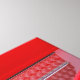Close up side view of some engine hoses on a red & silver custom hot rod.