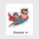 This sticker depicts a dynamic scene of a superhero dad soaring through the sky with his equally caped superhero son, symbolising the adventures shared and the unbreakable bond between father and son.