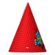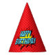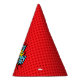 Two tone red dot party hat features Happy Birthday Word Art Graphic. Easy to assemble. Dot pattern coordinates with Superhero Party Collection in our shop as well as most Superhero themed birthday parties. Hat also available in our shop without the Happy Birthday graphic.