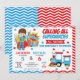 With bold stars, bright primary colours, and a playful red and blue zigzag border, this invitation is ideal for a joint birthday party, boy & girl shared birthday, superhero and train theme, transportation birthday party, editable kids birthday invite, and two-theme birthday celebration.