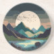 An abstract landscape of a massive supermoon in a mountain lake scene with a flock of birds in bold textures and dark earthy tones of brown, beige, tan, blue, cyan, and black.
