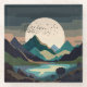 An abstract landscape of a massive supermoon in a mountain lake scene with a flock of birds in bold textures and dark earthy tones of brown, beige, tan, blue, cyan, and black.