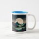 An abstract landscape of a massive supermoon in a mountain lake scene with a flock of birds in bold textures and dark earthy tones of brown, beige, tan, blue, cyan, and black.