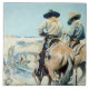 NC Wyeth was one of America’s greatest painter-illustrators. His masterpieces included Treasure Island and The Last of the Mohicans. This painting is called “Supply Wagon”. Two cowboys on horseback overlook a dusty plain, observing a group of people below. The scene captures the essence of the American West, featuring wide-brimmed hats and rugged attire.