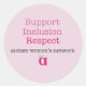 Image has the text in a typewriter font: "Support / Inclusion / Respect" in gradations of pink; "autism women's network" in black; and below is the AWN logo.
