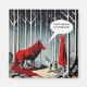 A bold red wolf and Little Red Riding Hood stand opposing each other where fear is expected, in a minimalistic, eerie forest.