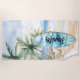A watercolored sandy beach, ocean waves and palm trees as background, and a blue surfboard on the beach. Personalise and add a name.