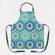 This apron has a geometric design of hexagons in four shades of blue on a field of tan stripes in two shades.