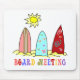 Funny surfing t-shirts, apparel and gifts for surfers featuring whimsical art of surfboards standing in the sandy beach with text reading, Board Meeting.