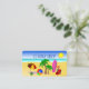 © Sunny Mars Designs. This fully customisable surf business card features a beach scene with beach items including a beach umbrella, a beach ball, flip flops, a bucket and spade, palm trees, a beach towel and a surfboard.