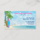 This business card features a surfboard on a tropical beach with palm trees. The water is a beautiful blue and there are clouds scattered in the sky. -