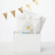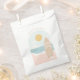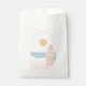 This cute and modern surf, beach favour bag features a woodgrain surfboard on a the beach with scattered shells.