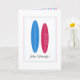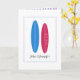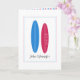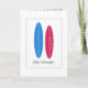 The card shows a blue and a pink surfboard. This modern design has space for the names of the husband and wife, as well as their wedding date.